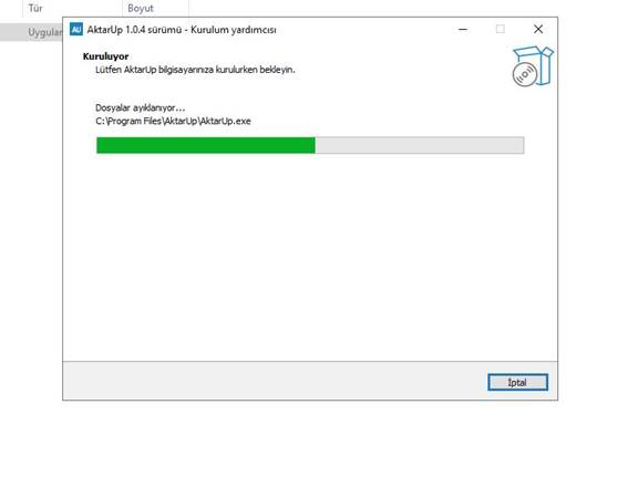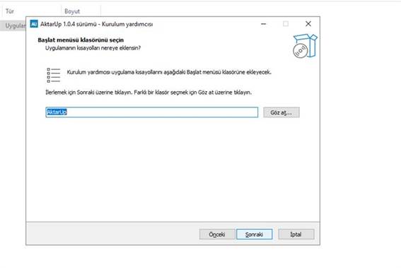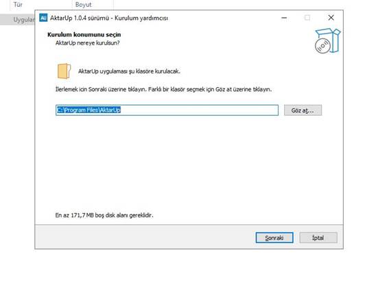 · Programın yükleneceği klasörü seçin (varsayılan: **C:\Program Files\AktarUp**).