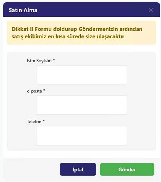 · **Gönder** ile talebinizi iletin; satış ekibi sizinle iletişime geçecektir.